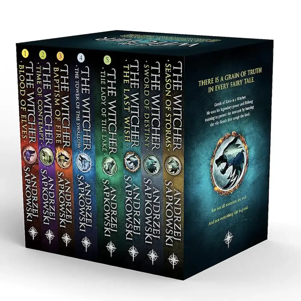 The Witcher Box Set by Andrzej Sapkowski, translated by Danusia Stok, brings together all eight epic novels from the world of The Witcher. Follow Geralt of Rivia — the monster hunter bound by destiny — through thrilling adventures, political intrigue, and moral complexity across a vividly imagined fantasy realm. This complete collection includes The Last Wish, Sword of Destiny, Blood of Elves, Time of Contempt, Baptism of Fire, The Tower of the Swallow, The Lady of the Lake, and Season of Storms. A must-have for fantasy lovers and fans of The Witcher series on Netflix.